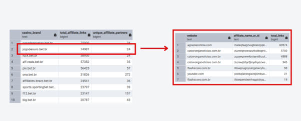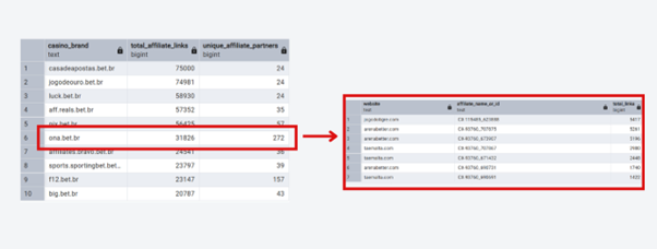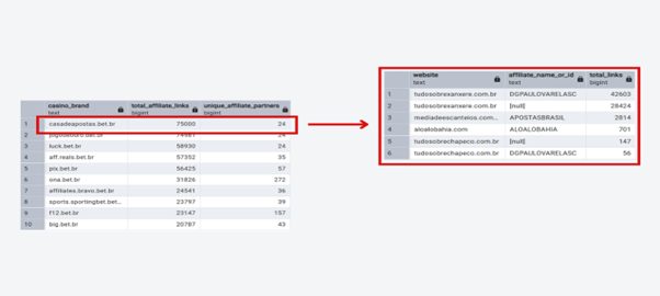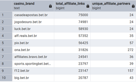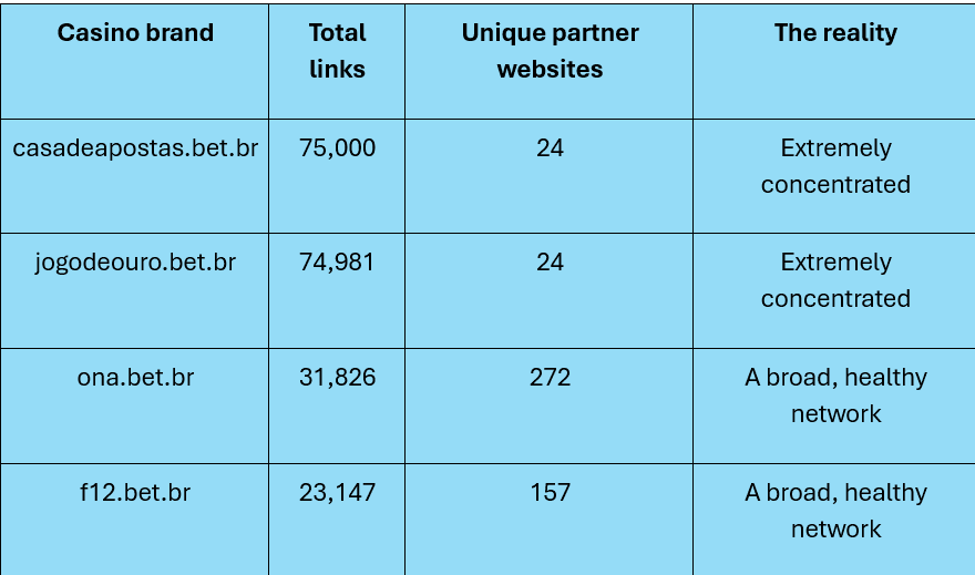 In contrast, Ona Bet and F12 Bet may have fewer total links, but they have six to 10 times more unique partners promoting them. This means their business is much more stable and spread out across the real Brazilian market.