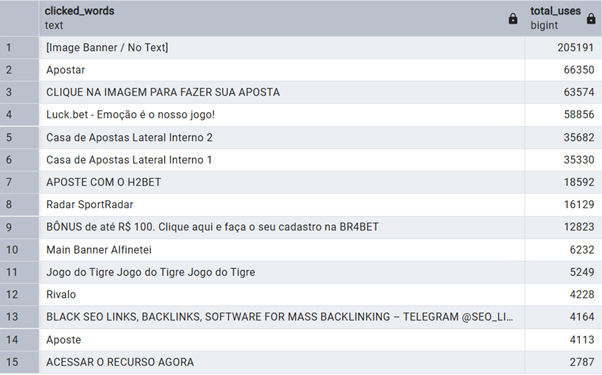 After uncovering where the links are coming from, we looked at the anchor text (the actual clickable words). This reveals how affiliates are presenting these links to the Brazilian public: