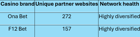 While the brands at the top of the list rely on sheer link volume from a few sources, Ona Bet and F12 Bet reveal what a genuine, diversified affiliate network looks like in the Brazilian market: